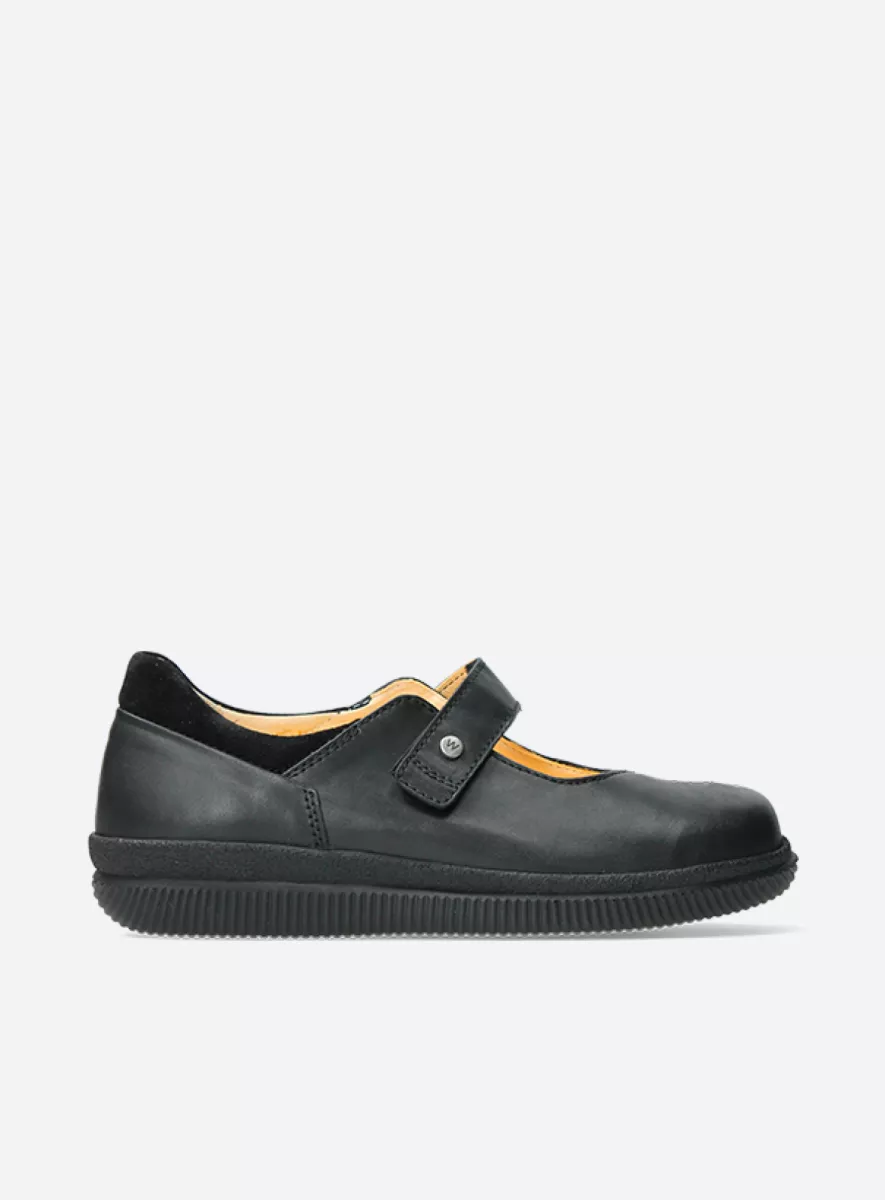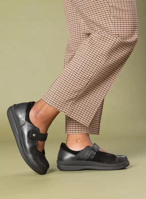 This model was made with all the features and benefits specifically to wide fitters. The Ultra-soft stretch leather on the inside gives that extra comfort for Hallux Valgus/bunions. A wide last, stable and lightweight outsole, extra allowance on the Velcro strap, along with a removable cork-latex footbed.